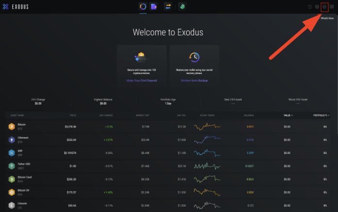 1. On the top right corner of your Exodus wallet, click on the “settings” icon.