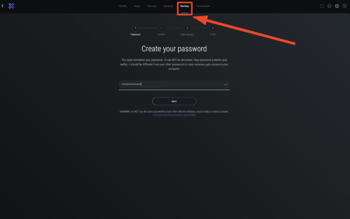 2. Click on “Backup” from the settings tabs, set a strong password, and click on “Next”. Write this password down and make sure you never forget it.
