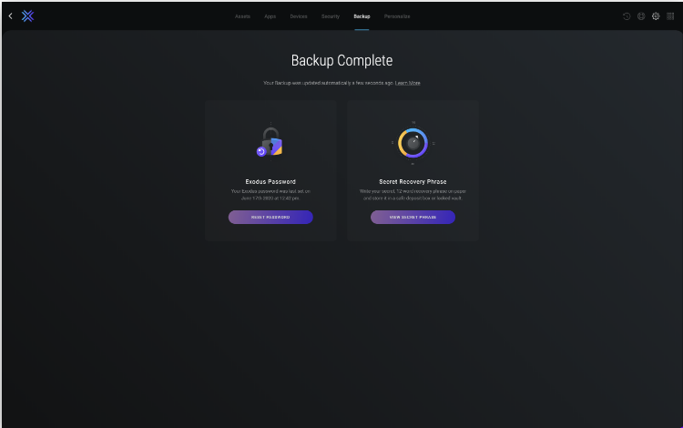 With Exodus Wallet, you have 2 backup features that enable you to access your wallet from another device, using a recovery phrase and email backup.
