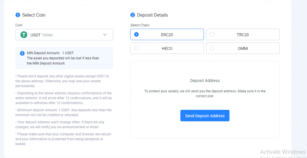 3. The details about the coin you want to withdraw will get displayed, select the coin’s “Chain” and click on “Send Deposit Address”
