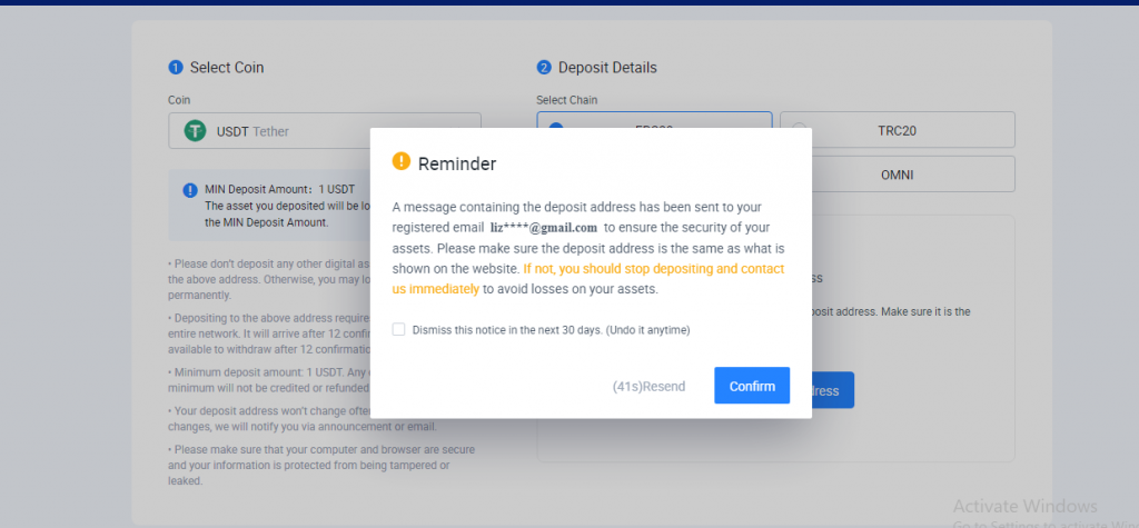 4. A message containing the deposit address will be sent to your email, If you have received the mail, click on “Confirm”.
