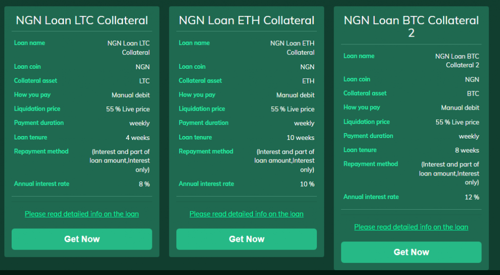 - Crypto-Backed Loans: This product enables you to obtain a crypto-collateralized Naira loan. You can use LTC, ETH, or BTC as collateral to get a Naira loan with varying interest rates. Impressive!